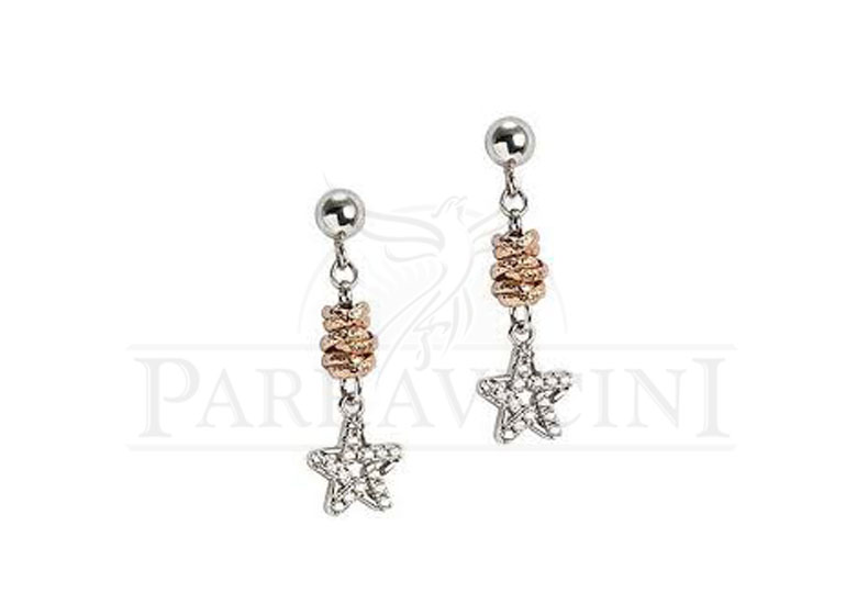 Orecchini Boccadamo in bronzo rodiato con pendente a forma di stelle zirconate, magliette cordonate placcate oro rosa e sfere liscia e rodiata.