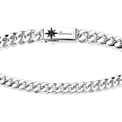 Bracciale da Uomo Zancan della Collezione Cosmopolitan. Bracciale in argento con chiusura gioiello. Catena a grumetta e chiusura a pressione rettangolare con stella rosa dei venti brunita e lucida, sicura a scatto