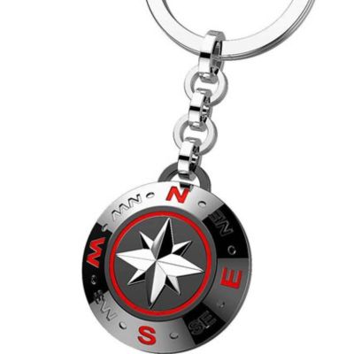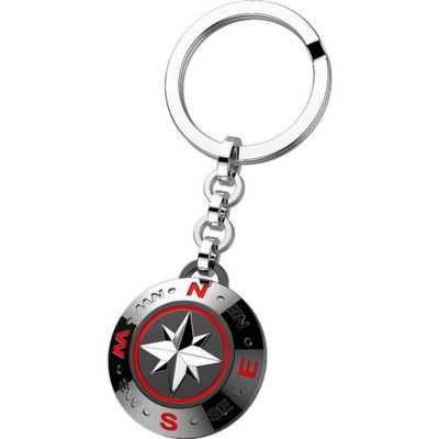 Portachiavi in acciaio con medaglia tonda brunita e rossa, anello a spirale. Stella rosa dei venti al centro in rilievo e punti cardinali che la circondano.Trattamento in PVD nero e rosso