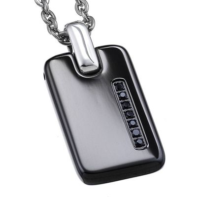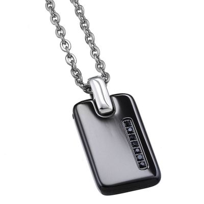 Collana Zancan in acciaio 316L. La collana ospita una piastrina in pvd nero con passante bianco e spinelli neri incastonati lateralmente.Il gioiello appartiene della collezione HiTekh, caratterizzata da materiali alternativi e da un design tecnicamente ricercato. L’accessorio perfetto per ogni occasione.