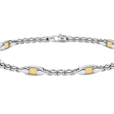 Bracciale da Uomo della Marca Zancan collezione Alpha. Il giropolso è realizzato in Argento 925 dal peso di 13,76 gr. Raffigura una catena ad anelli rettangolari con lavorazione lucida. Alternati alla catena troviamo le targhetta in Oro giallo 18 KT ambo i lati